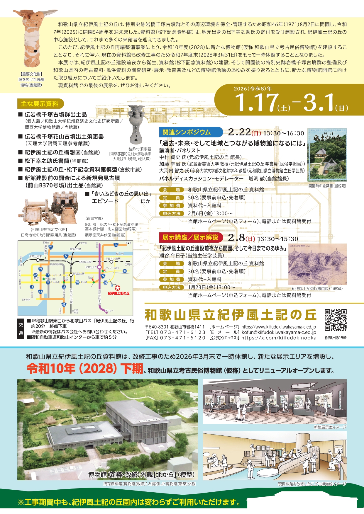 新着情報 2026年1月30日 1月ハニワづくり・まが玉づくりの情報をUPしました。 2026年1月23日 令和7年度休館記念冬期特別展 展示講座「紀伊風土記の丘建設前夜から開園、そして今日までのあゆみ」(2/8)の参加者募集を1月23日13時から開始します。 2026年1月14日 令和7年度「ボランティアが語る紀伊風土記の丘の魅力講座」の情報をUPしました。 2026年1月12日 令和7年度休館記念冬期特別展「紀伊風土記の丘のあゆみ」の情報をUPしました。 2026年1月12日 館長だよりを更新しました。 2026年1月11日 館長講座「古代の紀伊国を考える」第5回「史料から垣間見える産業と生活」(1/31)の参加者募集を1月15日13:00から開始します。 2026年1月9日 古墳ガイドツアー②の情報を更新しました。 2025年12月26日 ハニワが焼き上がりの情報を更新しました。 2025年12月26日 1月ハニワづくり・まが玉づくりの情報をUPしました。 2025年12月23日 学芸員講座「連続講座 岩橋千塚」第29回「岩橋千塚古墳群の今日的評価をさぐる」(1月18日(日))の参加者募集を12月25日13:00から開始します。 2025年12月17日 学芸員講座「高野」⑥「高野山と修験道」(1/11)の参加者募集を12月24日13:00から開始します。 2025年12月04日 チャレンジジュニア学芸員の入賞者のお知らせをUPしました。 2025年11月27日 【館長だより第11号】の情報をUPしました。 2025年11月26日 館長講座「古代の紀伊国を考える」第4回「木簡にみえる紀伊国」(12/13)の参加者募集を11月28日13:00から開始します。 2025年11月16日 12月ハニワづくり・まが玉づくりの情報をUPしました。 2025年11月16日 ハニワが焼き上がりました! 2025年11月3日 紀伊風土記の丘 休館記念秋期特別展「遥かなる古墳時代の海へ」関連講演会⑤の情報をUPしました。 < 2025年11月3日 鋳造体験 銅鏡の情報をUPしました。 2025年10月24日 紀伊風土記の丘 休館記念秋期特別展「遥かなる古墳時代の海へ」関連講演会④の情報をUPしました。 2025年10月24日 11月開催ハニワづくり・まが玉づくりのイベント情報をUPしました。 2025年10月10日 刊行物のページを更新しました。展示図録・特別展関連講演会資料集発売開始! 2025年10月10日 フトシ先生と観る風土記の植物③の参加者募集を開始しました。 2025年10月4日 紀伊風土記の丘 休館記念秋期特別展「遥かなる古墳時代の海へ」開幕しました。 展示目録を公開しました。 2025年9月25日 紀伊風土記の丘 休館記念秋期特別展「遥かなる古墳時代の海へ」関連講演会①~⑤の情報をUPしました。 2025年9月25日 紀伊風土記の丘 休館記念秋期特別展「遥かなる古墳時代の海へ」展示講座/展示解説の情報をUPしました。 2025年9月25日 10月4日・18日開催のハニワづくり・まが玉づくりの申込みは定員に達したため締切ました。 2025年9月12日 ハニワづくり・まが玉づくりのイベント情報をUPしました。 2025年9月12日 ハニワ引き取り情報を更新しました。 2025年9月9日 【令和7年度館長講座「古代の紀伊国を考える」第3回「天皇の行幸と紀伊国」】(9/27)の参加者募集を9月12日13:00から開始します。 >2025年9月2日 【連続講座「高野⑤」「鬼と傘~高野山麓の風流芸能~」】(9/21)の参加者募集を9月5日13:00から開始します。 2025年8月30日 16thHANI-1選手権エントリー作品をお持ち帰りいただけます。 2025年8月26日 【16th HANI-1選手権結果発表】※表彰式は8月30日13:00から開始します。 2025年8月22日 ★夏休みモノづくりハニワが焼き上がりました! 2025年8月5日 【館長だより第9号】の情報をUPしました。 2025年7月24日 【令和7年度重要文化財和歌山県大日山35号墳出土品保存修理業務委託に係るプロポーザルの実施について】選定結果を掲載しました。 2025年7月13日 【夏休みモノづくりイベント】まが玉づくりは定員に達したため申込みを締切りました。 2025年7月12日 【夏期企画展「高野山麓・山里のしごと」】の情報をアップしました。 2025年7月9日 【第16回 HANI-1選手権の投票】の情報をアップしました 2025年7月7日 【夏休みモノづくりイベント まが玉づくり】の情報をアップしました 2025年7月2日 【夏休みモノづくりイベント】ハニワづくりは定員に達したため申込みを締切りました。 2025年7月2日 【令和7年度重要文化財和歌山県大日山35号墳出土品保存修理業務委託に係るプロポーザルの実施について】質問回答を掲載しました。 2025年7月1日 【館長講座「古代の紀伊国を考える」第2回「紀伊国の成立②国衙・郡・郷と交通」の募集を7月4日13時から開始します。 2025年6月27日 【楽しく学ぶ紀伊風土記の丘(夏休みイベント一覧)】の情報をUPしました。 2025年6月21日 【岩橋千塚古墳群 特別史跡追加指定答申記念報告会】の募集を開始しました。 2025年6月19日 【令和7年度重要文化財和歌山県大日山35号墳出土品保存修理業務委託に係るプロポーザルの実施について】を公開しました。 2025年6月12日 【「フトシ先生と観る風土記の植物②」夏の植物 草むらで大発見!の募集を開始しました。 2025年6月10日 【学芸員講座「高野」④】の情報をUPしました。 2025年5月31日 【花だより275】の情報をUP