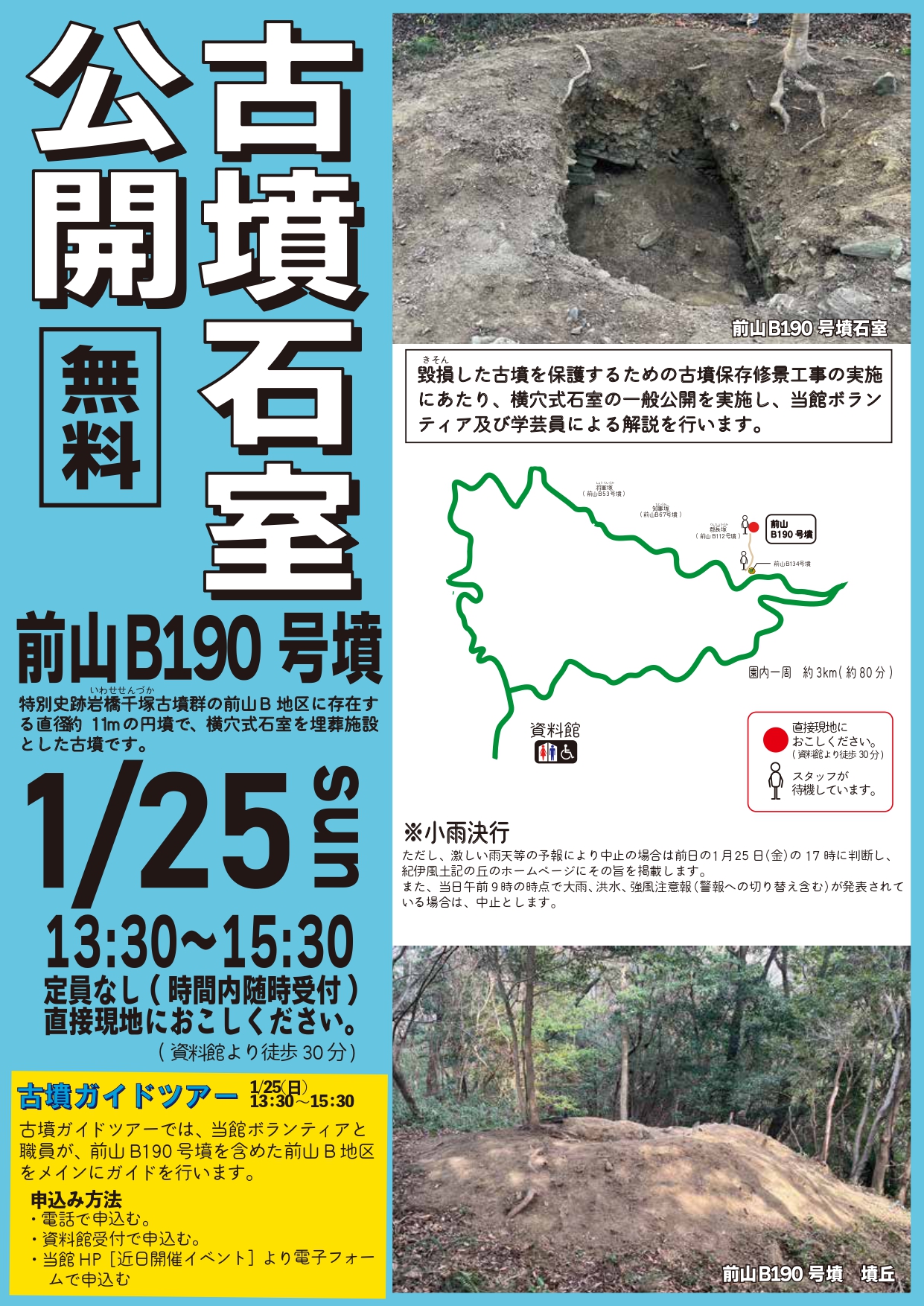 和歌山県立紀伊風土記の丘について 和歌山県立紀伊風土記の丘は、国の特別史跡「岩橋(いわせ)千塚古墳群」の保全と公開を目的として1971年8月に開館した、考古資料・民俗資料を中心とした県立の博物館施設(登録博物館)です。園内は約67haの広さがあり、標高150mの丘陵から北斜面一帯に、大小およそ500基の古墳が点在しています。また、麓には国・県指定の移築民家集落や万葉植物園があり、四季を通じて里山の自然をお楽しみいただけます。