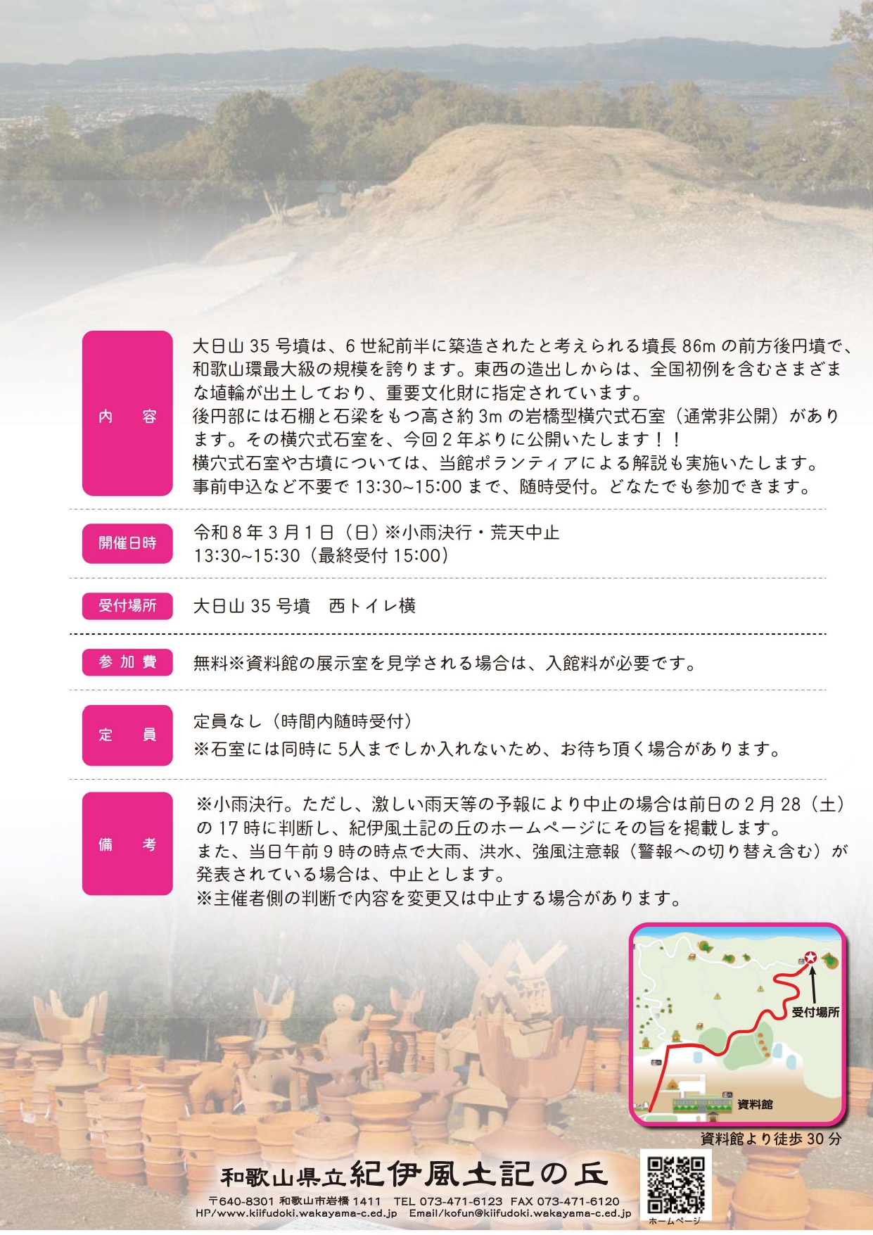 受付申込:事前申込不要。当日現地受付(大日山35号墳)までお越しください。 ※大日山35号墳まで、資料館より徒歩30分程度かかります。