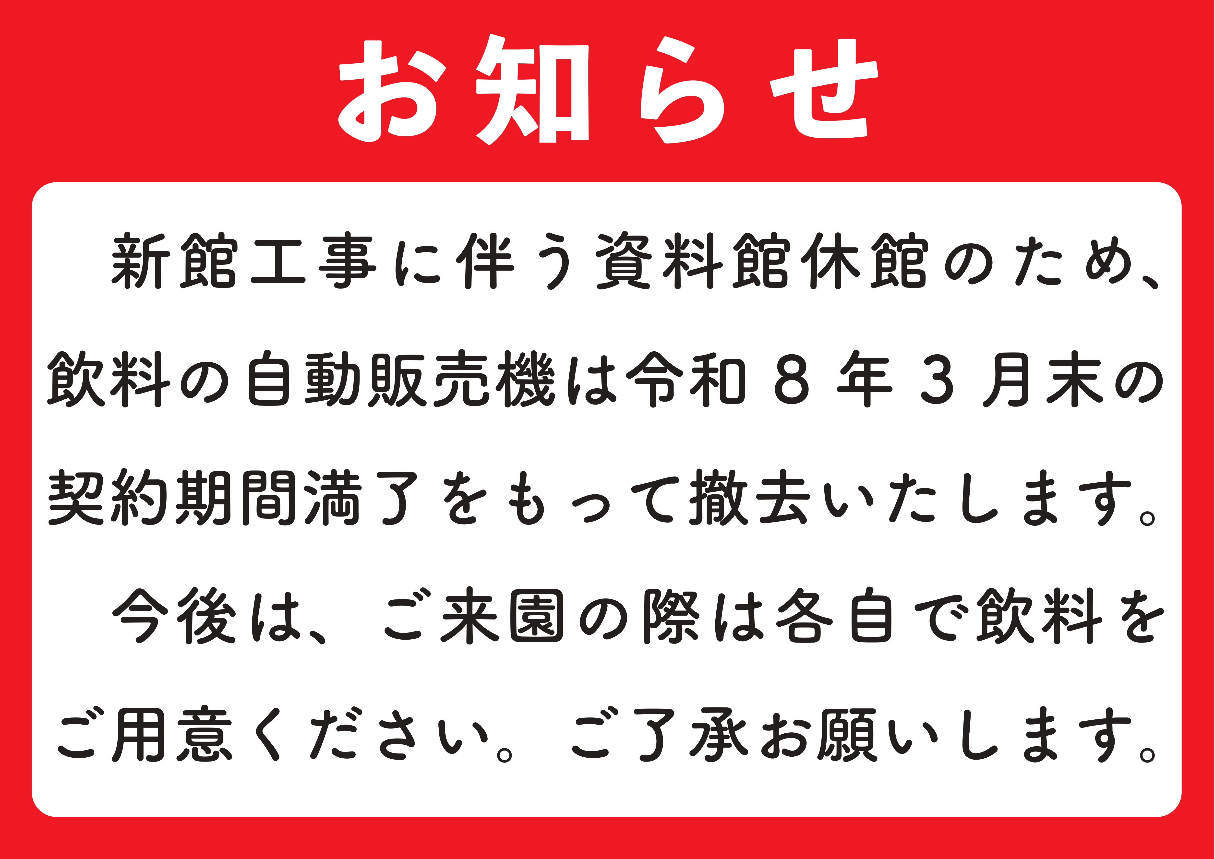 また併せまして、当館に設置している自動販売機の撤去についてもお知らせいたします。